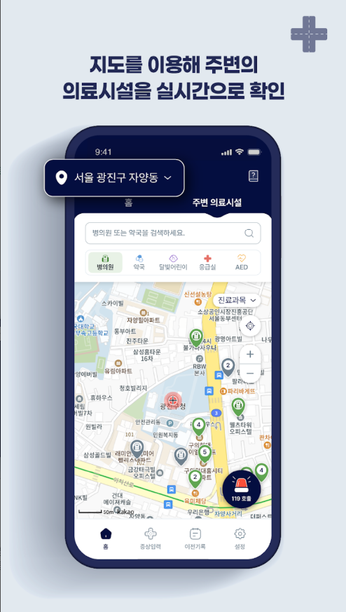 '응급실 찾기' 메뉴에서 현재 위치 기준 반경 10km 이내 응급실을 거리순으로 보여주며, 각 병원의 응급실 혼잡도, 대기시간, 진료 가능 여부를 실시간으로 확인할 수 있습니다. 전화연결 버튼을 누르면 바로 해당 응급실로 전화가 연결됩니다.